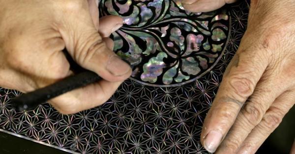 螺钿漆器的主要材料是漆与螺钿。匠人需要读懂保留自然光泽的贝壳纹路,调和其五彩光芒。根据用途制作木胎,打磨光滑表面后粘贴螺钿,经过数十次上漆打磨方能成型。源自匠人慧眼与细致工序的螺钿漆器,历来被视为顶级工艺珍品。